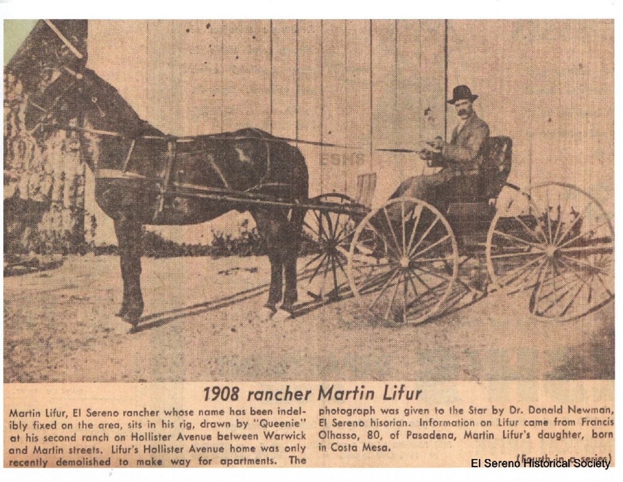 In the same era, Jose Domingo Batz married Josetha (Josefa) Lifur, whose brother, Martin Lifur, eventually bought the acreage now known as Sierra Park. In 1890, Mr. Martin Lifur purchased 320 acres of the Batz Ranch—the part of El Sereno known as Sierra Park. Part of the 125-year-old ranch house can still be seen near the corner of Lifur and Navarro. Lifur Avenue and Martin Street were named after him, also Navarro, the province in Spain from which he came. Edna is another street named after the Lifur Family. He left a rich heritage and many memories. His son and daughter lived in the community for many years.