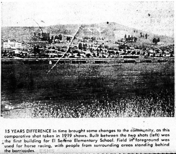 The caption reads:15 years difference in time brought some changes to the community, as this comparative shot taken in 1919 shows. Built between the two shot (left) was the first building for El Sereno Elementary School. Field in foreground was used for horse racing, with people from surrounding areas standing behind the barricades. This is a better picture of the article clipping below.