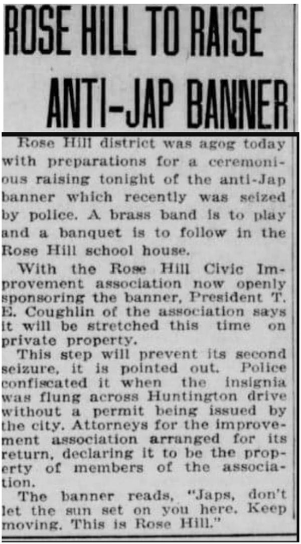 Unfortunately for the Japanese, the ugly head of racism raised its head. It soon became an open fact that Rose Hill did not accept or want anyone of color living among them. Under the name of the Rose Hill Civic Improvement Association, the white-only district made this clear when they organized and paid for a banner that read