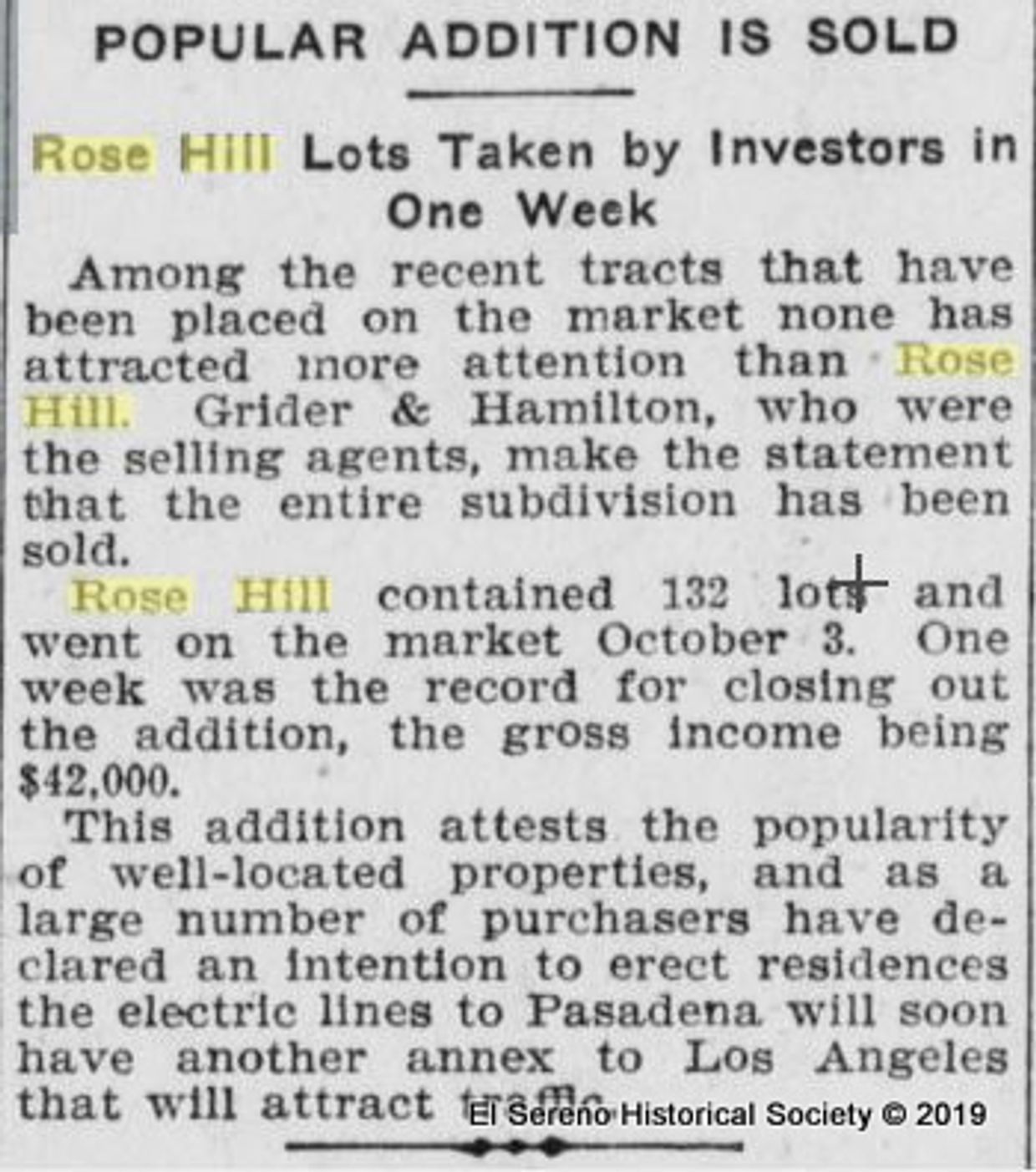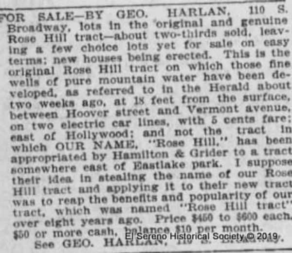 Mr. Harlan caught wind of the shenanigans and wasted no time in calling out the name stealing, posting an article in the Los Angeles Times. Mr. Harlan makes it very clear that the original Rose Hill predates the Rose Hill in El Sereno by eight years (since 1896), stating that, “I suppose their idea in stealing their name of our Rose Hill tract and applying it to their new tract was to reap the benefits and popularity of our tract, which was named ‘Rose Hill tract’ over eight years ago.”